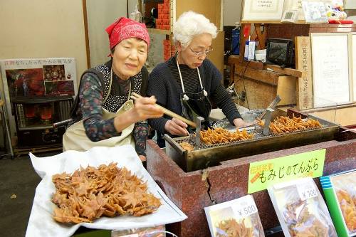 Ngoài ra hai bên đường là những món ăn đặc trưng mùa thu được bày bán như momiji tempura với hình lá phong chiên giòn lôi cuốn.