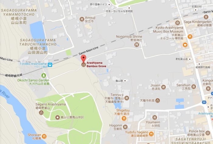 Rừng tre Arashiyama (dấu đỏ trên bản đồ) được CNN xếp vào top 100 con đường tuyệt nhất thế giới. Ảnh chụp màn hình.