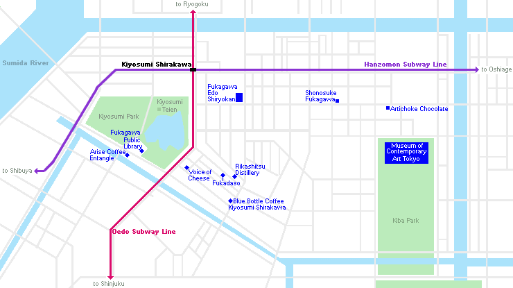 Nằm ở phía đông của ga Tokyo, gần sông Sumida, khu vực Kiyosumi Shirakawa hiện lưu giữ nhiều shitamachi (thị trấn thấp, xóm làng). Với nét đẹp cổ kính, đây được xem là một trong những "thị trấn cà phê" đang phát triển ở Tokyo. Du khách có thể tìm thấy nhiều quán cà phê theo những phong cách khác nhau.