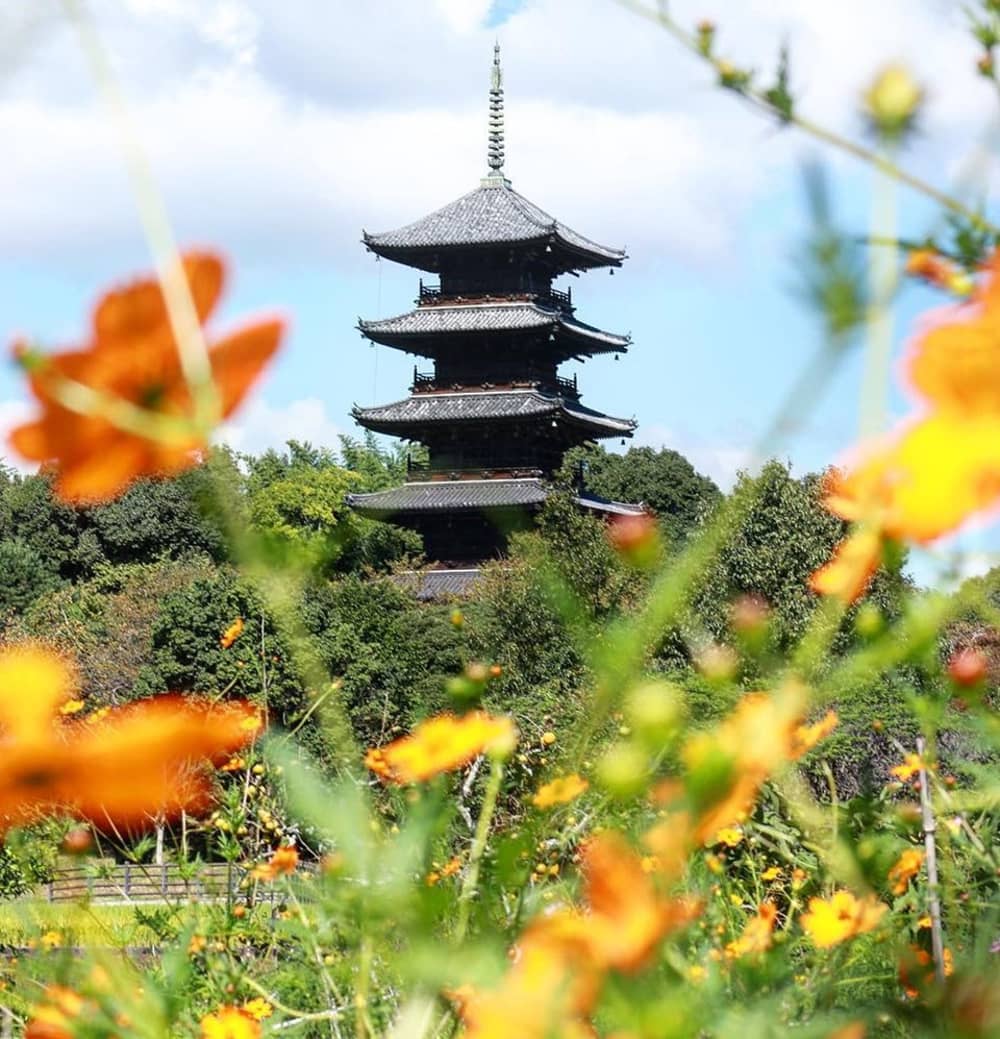 Ngôi đền năm tầng nằm trong khu Bichu Kokubunji, Okayama, là chốn dừng chân thích hợp để bạn có thể nhìn thấy cánh đồng hoa cosmos tuyệt đẹp. Đứng sau tòa nhà này, bạn chiêm ngưỡng cảnh sắc “anh đào mùa thu” lấp lánh trong nắng, đung đưa trong gió, rực rỡ giữa chốn linh thiêng.