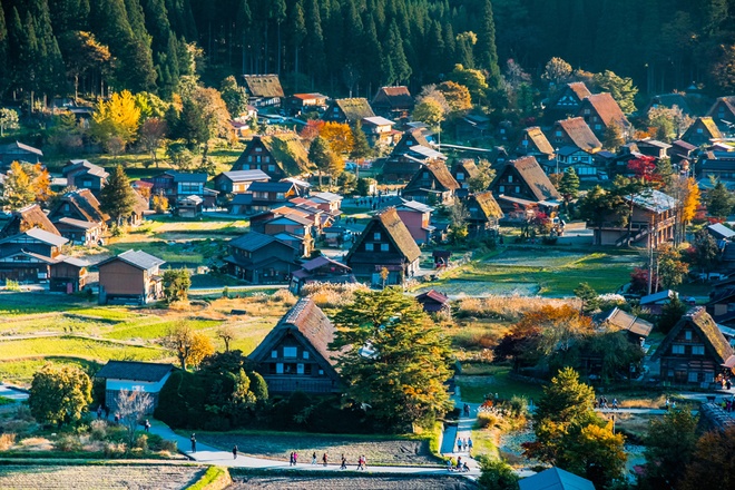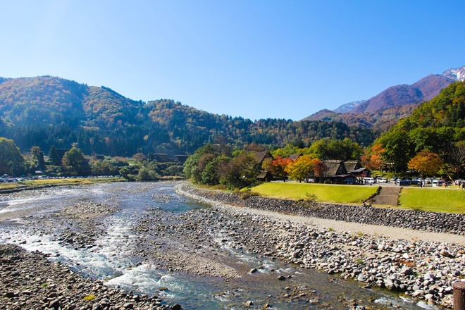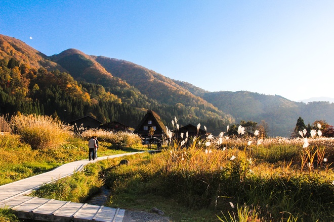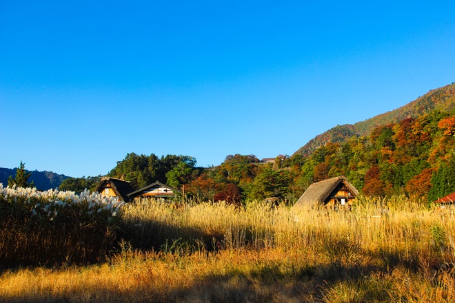 Ngôi làng Shirakawa-go trong những ngày trời thu xanh ngắt với những ngôi nhà bao phủ bởi cỏ lau cao vút, phía sau là mảng rừng cây đủ màu đỏ, vàng, xanh của thiên nhiên.