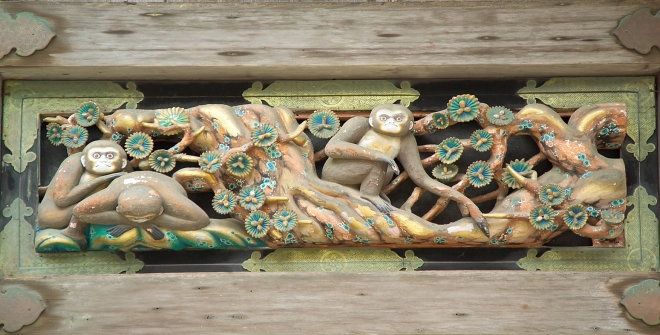 Nổi tiếng nhất phải kể đến bức điêu khắc 3 chú khỉ trên cửa vào ngôi đền: Một chú khỉ bịt mắt, một chú khỉ bịt miệng, một chú chú khỉ bịt tai hàm ý không nhìn điều xấu, không nói điều xấu, không nghe điều xấu. Người nghệ nhân đã dùng hình ảnh những chú khỉ để nói về người. Tác phẩm điêu khắc này là một trong những quốc bảo của Nhật Bản.