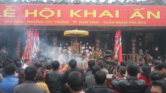 7. Khai ấn Đền Trần, Nam Định Lễ hội ở đền Trần thường diễn ra 3 ngày, từ 13 đến 15 tháng Giêng âm lịch hàng năm. Hội mở đầu bằng lễ khai ấn bắt đầu từ giờ Tý (giữa đêm). Ấn được phát tại 3 nhà là nhà Giải Vũ, nhà trưng bày đền Trùng Hoa và một điểm trong khu vực vườn cây đền Trần. Thời gian gần đây, ngày càng nhiều người tới hành lễ tại đền Trần vào dịp hội để xin/mua được tờ ấn với mong ước sẽ được thăng tiến trong nghề nghiệp.