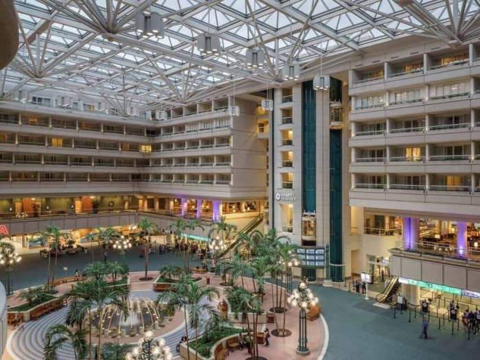 Nghỉ ngơi trong phòng khách sạn ở Orlando: Nếu phải chờ đợi nhiều giờ, bạn có thể đặt phòng ở khách sạn Hyatt Regency trong nhà ga chính của sân bay. Khách sạn có bể bơi ngoài trời lớn, ghế tắm nắng và phòng tập thể hình mở 24h/7.