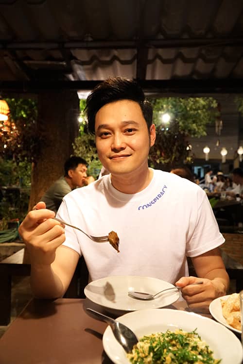 Không riêng gì Chiang Mai, khi lần đầu đặt chân đến một vùng đất nào đó, hoàng tử sơn ca luôn thích thú khám phá những món ăn ngon, đặc trưng cho ẩm thực của địa phương đó. Quang Vinh kể lại, kỷ niệm khó quên nhất trong chuyến đi Chiang Mai lần này là lúc ăn canh trứng kiến nấu với rau. Đây là món chỉ có theo mùa và không có nhiều nơi bán món này.