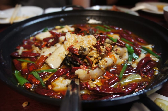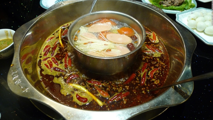 Lẩu cay, Trùng Khánh: Nước lẩu được cho thêm một lớp mỡ bò, ớt đỏ tươi và khô, cùng 20 loại gia vị, thảo mộc khác. Bất cứ loại thịt, rau, mì hay đậu nào nhúng vào nồi đều sẽ có vị cay đậm đà, khiến bạn phải xuýt xoa mãi sau khi ăn xong.
