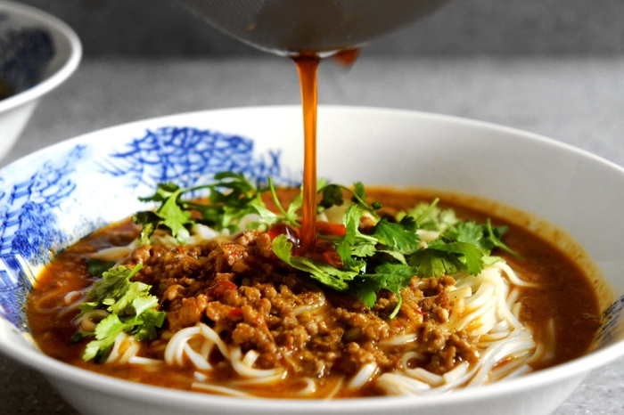 Mì dan dan, Tứ Xuyên: Đặc sản này gồm mì, chan sốt tương đen cay, cho thêm thịt lợn xay, tỏi xay, đậu phộng, hành tươi và rau mùi. Sốt được cho xuống dưới mì và thực khách cần trộn lên khi ăn.