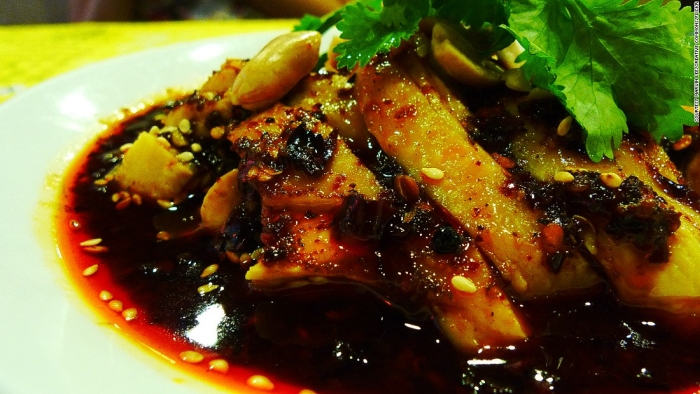 Gà chảy nước miếng, Tứ Xuyên: Sở dĩ món này có tên như vậy do người ăn nghĩ đến là chảy nước miếng vì thèm. Trong đó, gà luộc được rưới đẫm sốt làm từ dầu mè, ớt và hơn 10 loại gia vị, tạo ra vị cay xé lưỡi nhưng ngon miệng.