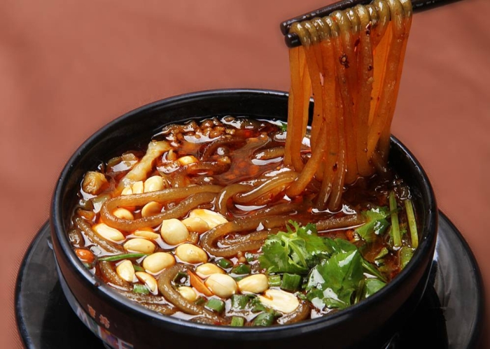 Miến chua ngọt, Trùng Khánh: Món ăn đường phố này có giá khá rẻ và phổ biến khắp Trung Quốc. Miến làm từ bột khoai lang được nấu trong nước dùng làm từ đậu nành, tương ớt, dấm và sa tế.