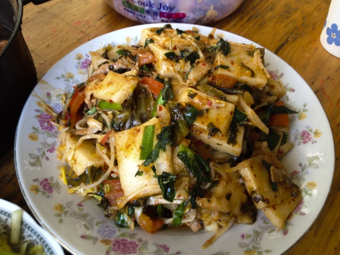 Bánh gạo gà cay, Vân Nam: Bánh gạo nếp được hấp và cắt thành miếng nhỏ, sau đó xào với ớt cay và thịt gà rán giòn xé nhỏ.