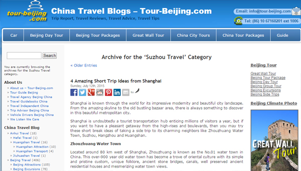 Về mức độ nổi tiếng thì không bằng 2 website nói trên nhưng Tour-beijing.com được rất nhiều người dùng yêu thích, thậm chí còn được coi là "vị cứu tinh" ở đất nước hầu như không nói tiếng Anh này. Thực chất, đây cũng là website bán tour nhưng phần blog - nơi các blogger chia sẻ về kinh nghiệm của mình - lại là nơi được nhiều người ghé thăm nhất.