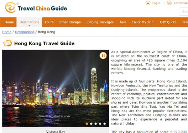 Travel China Guide thực chất là một trang web bán và tư vấn các dạng tour mở với mạng lưới quy mô nhất ở Trung Quốc. Tuy nhiên, bên cạnh mục đích thương mại, website cung cấp rất nhiều thông tin chi tiết cho khách du lịch - những ai muốn tự khám phá Trung Quốc một mình mà không mua tour.
