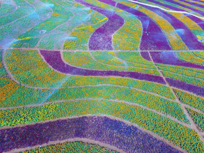Biển hoa nhiều màu sắc tạo nên bức tranh sống động tại huyện Húng An, tỉnh Quý Châu.