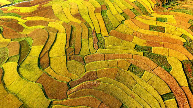 Cánh đồng lúa bậc thang vào mùa thu hoạch ở thành phố Quý Dương, tỉnh Quý Châu.