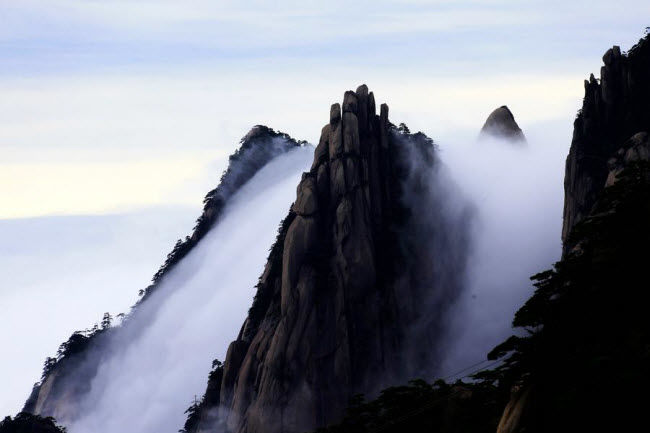Mây xuất hiện như thác nước đổ xuống vách núi sau mưa trên núi Hoàng Sơn, tỉnh An Huy.