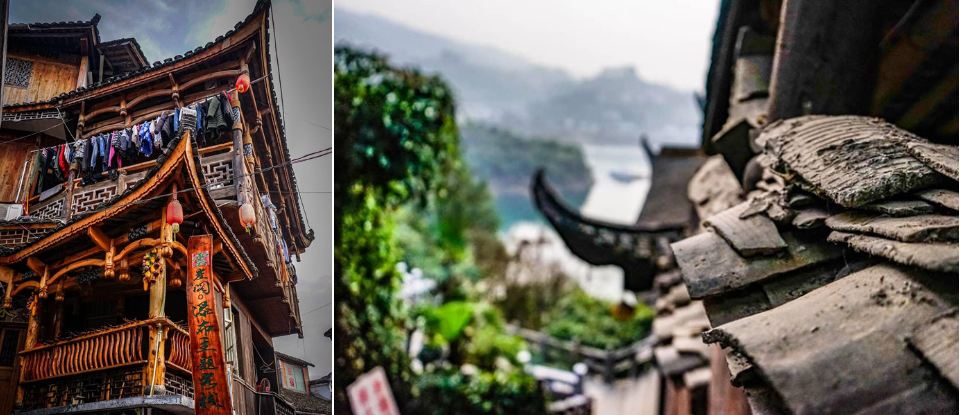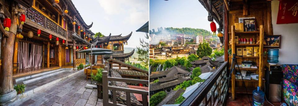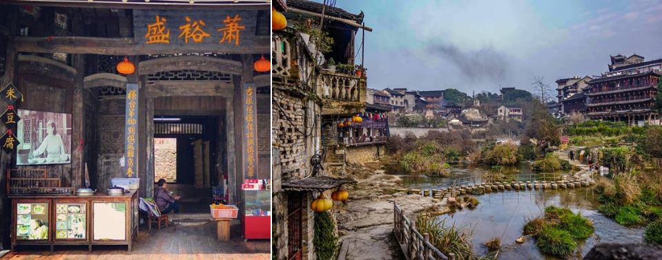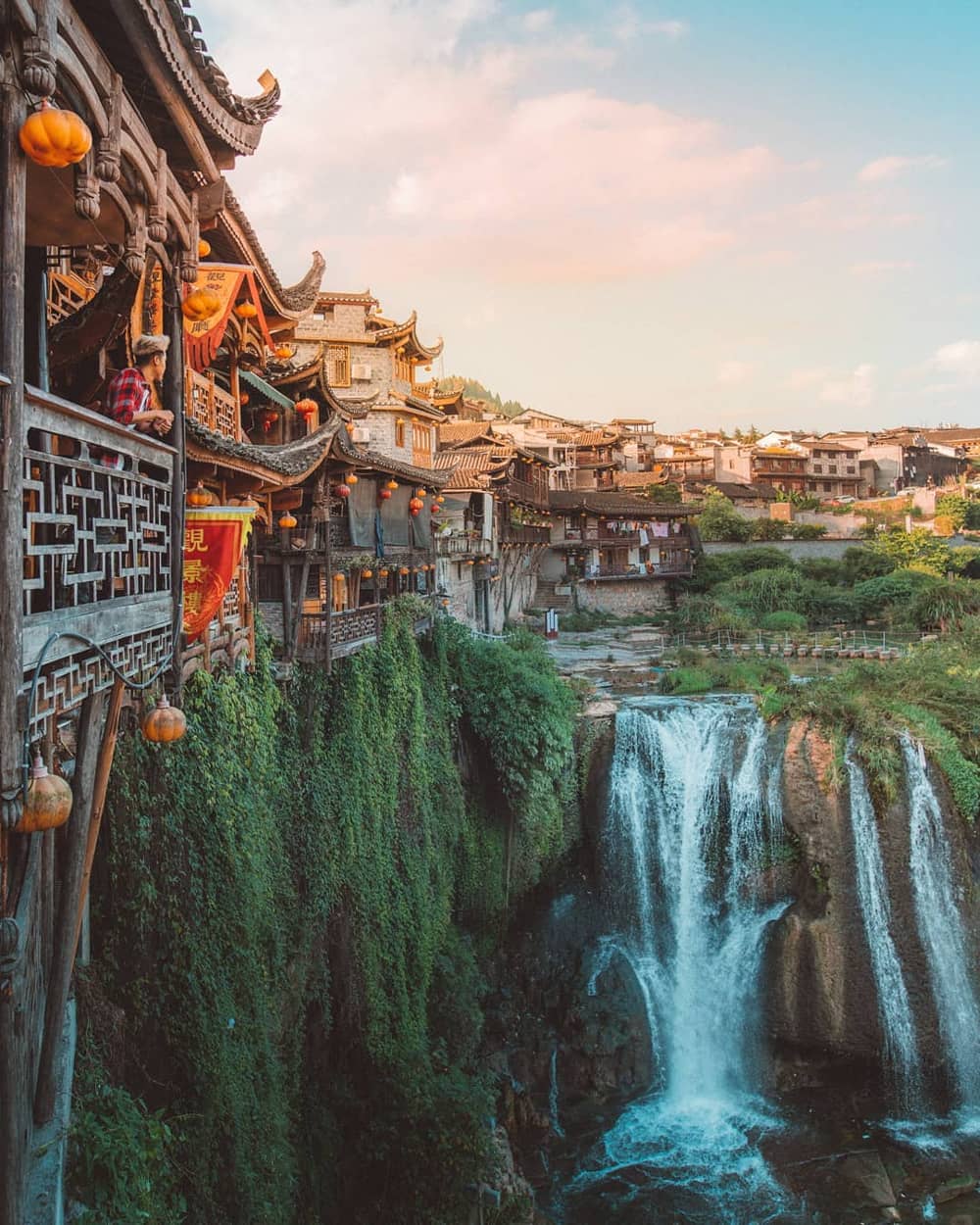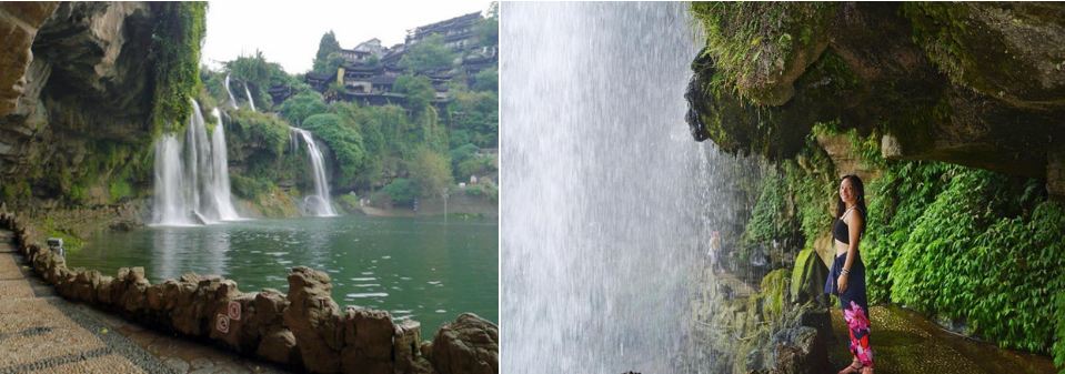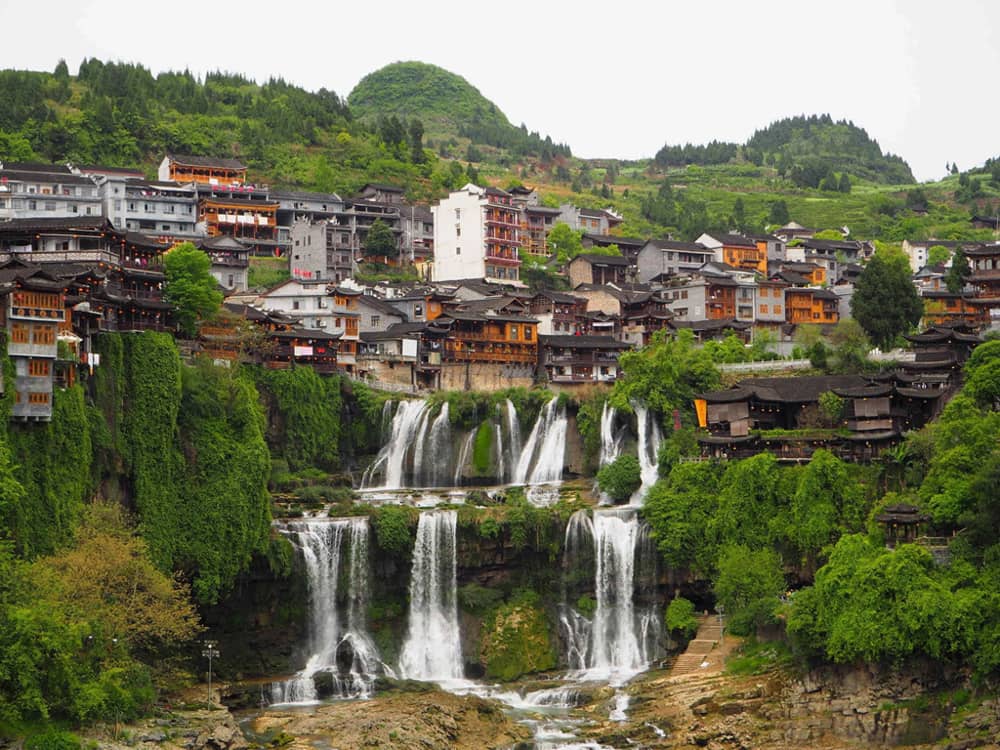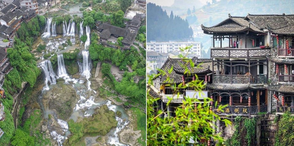 Nhìn từ xa, giữa cảnh núi non trập trùng, cổ trấn như đang lơ lửng, treo mình trên thác nước.
