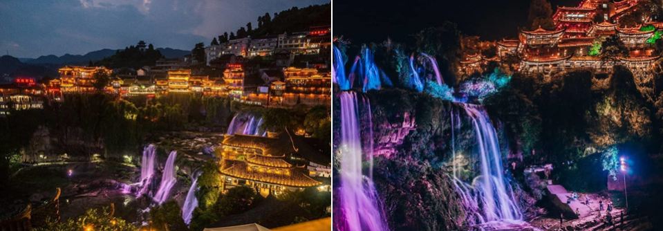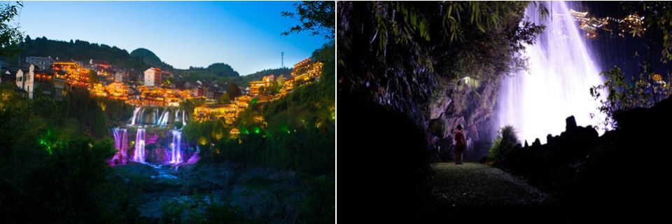 Con thác chính là điểm nhấn của Phù Dung. Trong đêm, dưới ánh đèn lung linh, cổ trấn hiện lên tựa xứ thần tiên giữa đời thực.