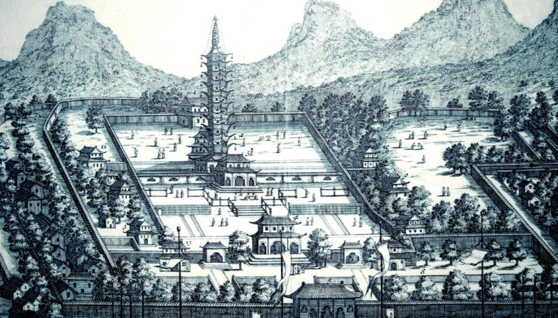 Phá hủy bởi quân phiến loạn – Chỉ một phần nhỏ của Đền Bao’en còn sót lại khi bị quân nổi dậy chiếm đóng thành phố và cướp tháp Sứ trong cuộc nổi loạn Thái Bình Thiên Quốc vào thế kỷ 19
