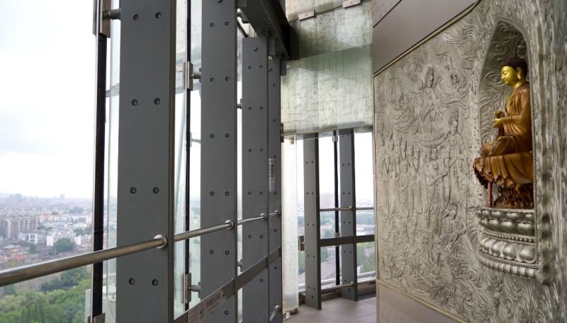 Tòa tháp mới được tài trợ phục dựng bởi một người đàn ông giàu nhất Trung Quốc – Wang Jianlin. Cạnh đó là một bảo tàng với chủ đề Phật giáo cũng được mở vào cuối năm 2015.