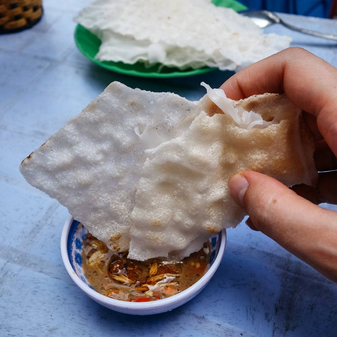 Bánh tráng đập: Người con xứ Quảng không ai xa lạ với món ăn dân dã gắn liền tuổi thơ có giá bình dân này. Bánh tráng đập dập có 2 lớp bánh tráng giòn bên ngoài, bên trong là bánh ướt mềm dẻo. Người đầu bếp sẽ nướng vàng hai mặt bánh tráng giòn bên ngoài cho dậy hương thơm trước khi phục vụ thực khách. Ảnh: @annamquan.