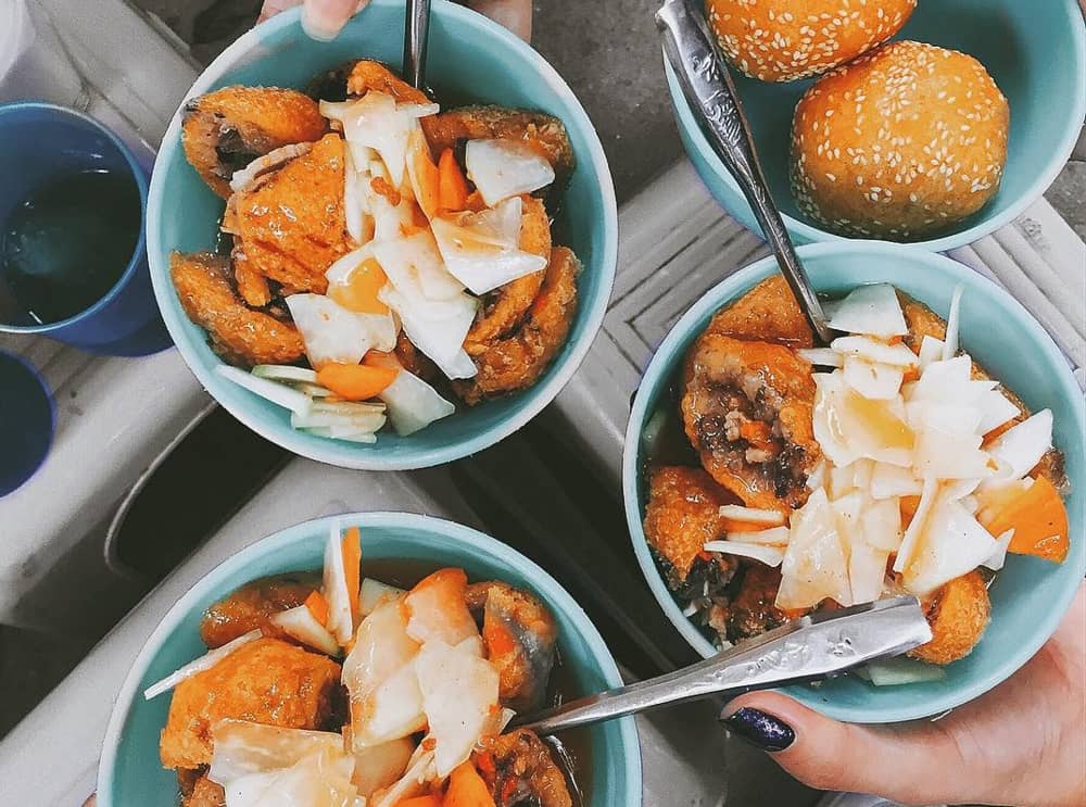 Những chiếc bánh vàng ươm, thơm dẻo kèm nước mắm nhạt và dưa góp ăn sẽ không bị ngán. Điểm đặc biệt ở những chiếc bánh này là vỏ bánh khá giòn. Nếu không kịp ăn tại quán, bạn có thể mua về nhà mà vẫn thưởng thức được hết vị ngon giòn rụm của bánh. Ảnh: @tuananh_301.