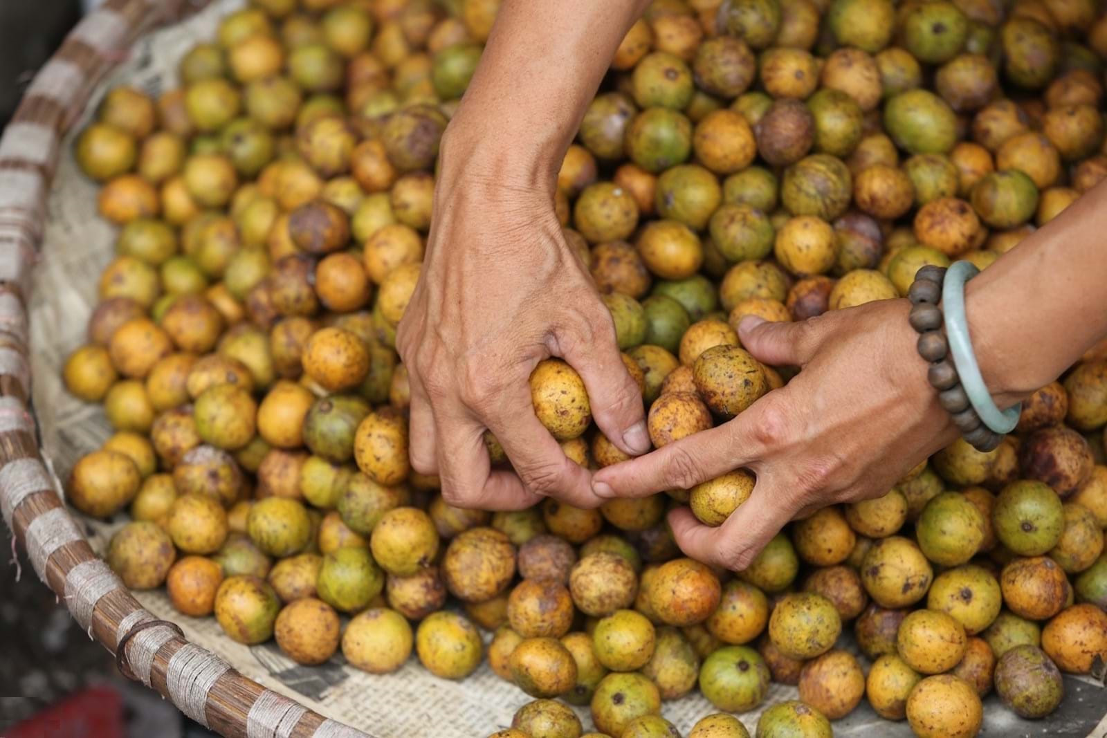Sấu chín cạo sạch lớp vỏ bên ngoài, khía thịt sấu quanh hột, đem trộn đường, muối, ớt cay tạo nên hương vị chua cay đặc biệt. Với nhiều tín đồ ưa chua, sấu chín là món ăn vặt khoái khẩu trong tiết trời thu mát mẻ. Ảnh: Vũ Minh Quân.