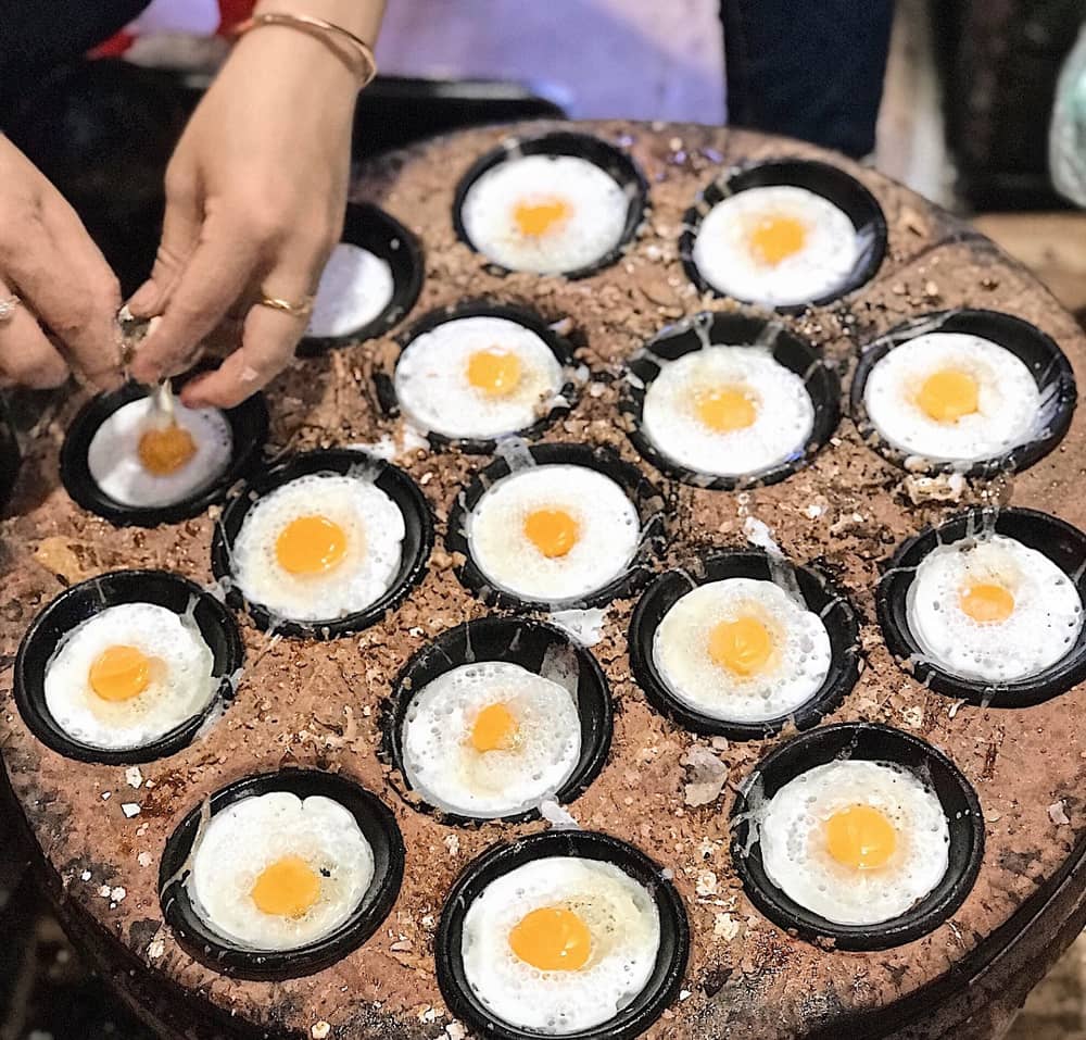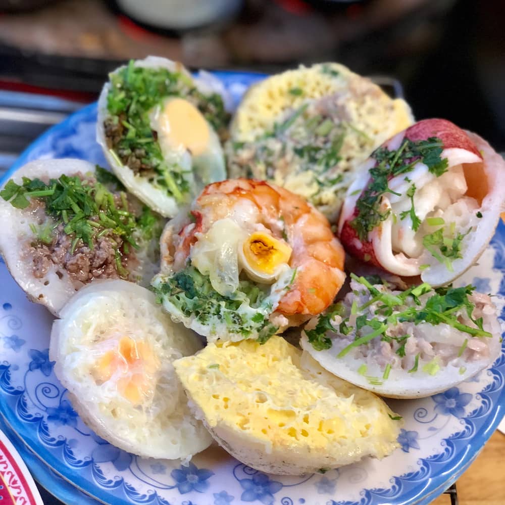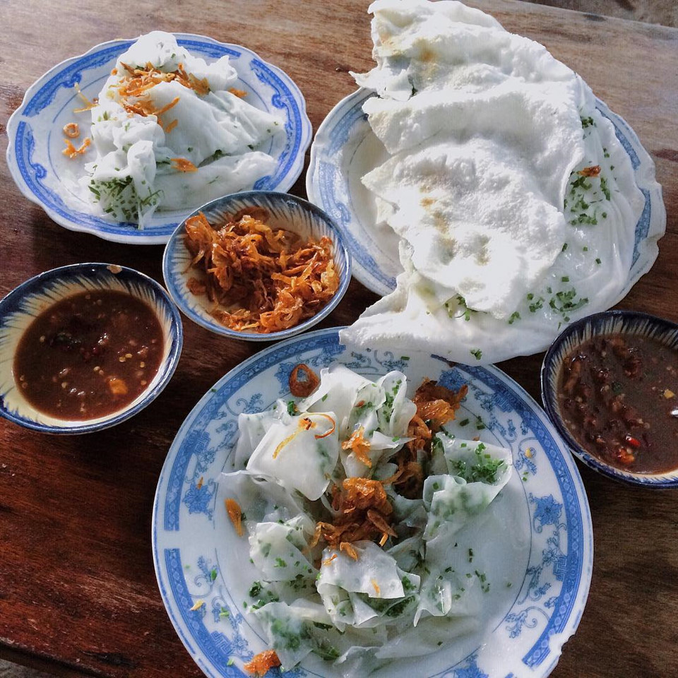 Bánh căn (Ninh Thuận): Theo người dân địa phương, bánh căn có nguồn gốc từ người Chăm ở Ninh Thuận. Bánh căn Ninh Thuận có bốn loại nước chấm là nước cá kho với dưa, mắm ngọt, mắm đậu phộng và mắm nêm, ăn kèm với tép mỡ và xoài sống. Nước chấm được múc ra tô lớn, thực khách để bánh vào tô rồi thưởng thức chứ không chỉ chấm như các nơi khác. Bánh căn (và bánh xèo) là món ăn sáng, ăn chiều, ăn vặt của người nơi đây. Ảnh: Rosetruong.rose, Hilaceyy.