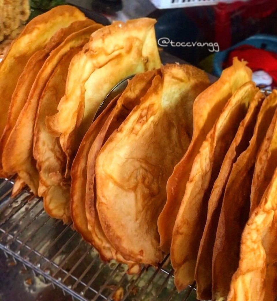 Bánh xèo Hải Phòng: Thứ bánh đơn giản chỉ có bột mì, nước, đường, vanilla thôi mà cứ chiều đến là ai cũng thèm. Bánh mỏng, viền giòn tan, ngọt vừa phải, chẳng cần chấm tương hay chấm mắm mà vẫn rất ngon. Dân chợ Cố Đạo gọi loại bánh này là bánh xèo. Chỉ năm phút sau khi đưa ra, một sạp hàng có thể hết veo trong chốc lát. Ảnh: @toccvang.