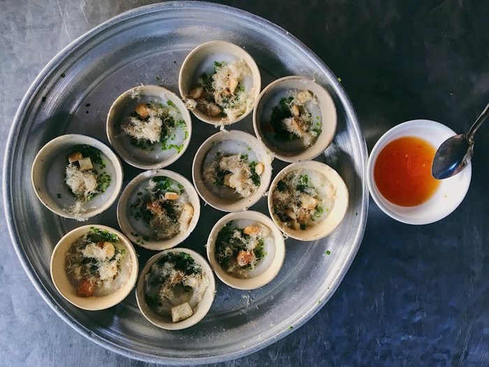 Bánh bèo chén dưới chân núi Nhạn nhỏ bằng nắm tay trẻ em, thêm bánh mì, chà bông và mỡ hẹ thay vì mỡ hành lên trên rồi chan nước mắm chua ngọt cay cay là đúng điệu. Một khay 10 chén giá 15.000 đồng, vừa đủ cho một người ăn.