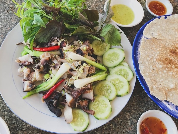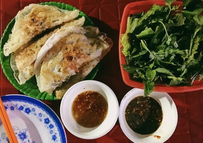 Bánh xèo tôm mực tươi đổ theo kiểu miền Trung có vỏ giòn rụm, cuốn rau sống chấm mắm ngọt hoặc mắm nêm ăn lạ miệng. Món ăn trông có vẻ không mấy hấp dẫn nhưng vị ngọt tươi của hải sản hòa với nước mắm nguyên chất gây ấn tượng với bạn ngay khi nếm thử.