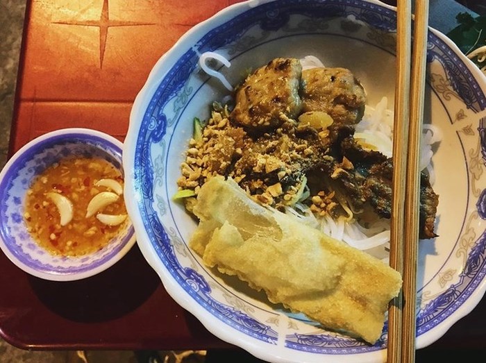 Bún khô là tên dân địa phương gọi món bún thịt nướng quen thuộc do bún không ăn chung với nước lèo mà chan nước mắm, thêm vài nhánh tỏi Lý Sơn thơm nức mũi. Thịt ướp vừa ăn, mềm, bánh tráng chiên giòn rụm hòa với vị bùi của đậu phộng, ăn chung với rau sống quê đã miệng. Mỗi người một tô 30.000 đồng là no nê.