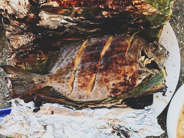 Cá dìa tươi bọc một lớp lá chuối rồi thêm lớp giấy bạc nướng mọi chắc chắn sẽ khiến bạn hài lòng bởi chất lượng đồ biển ở đây không tệ. Một con cá khoảng 0,5 kg giá 130.000 đồng, thịt săn chắc, ngọt dậy mùi thơm khó cưỡng.