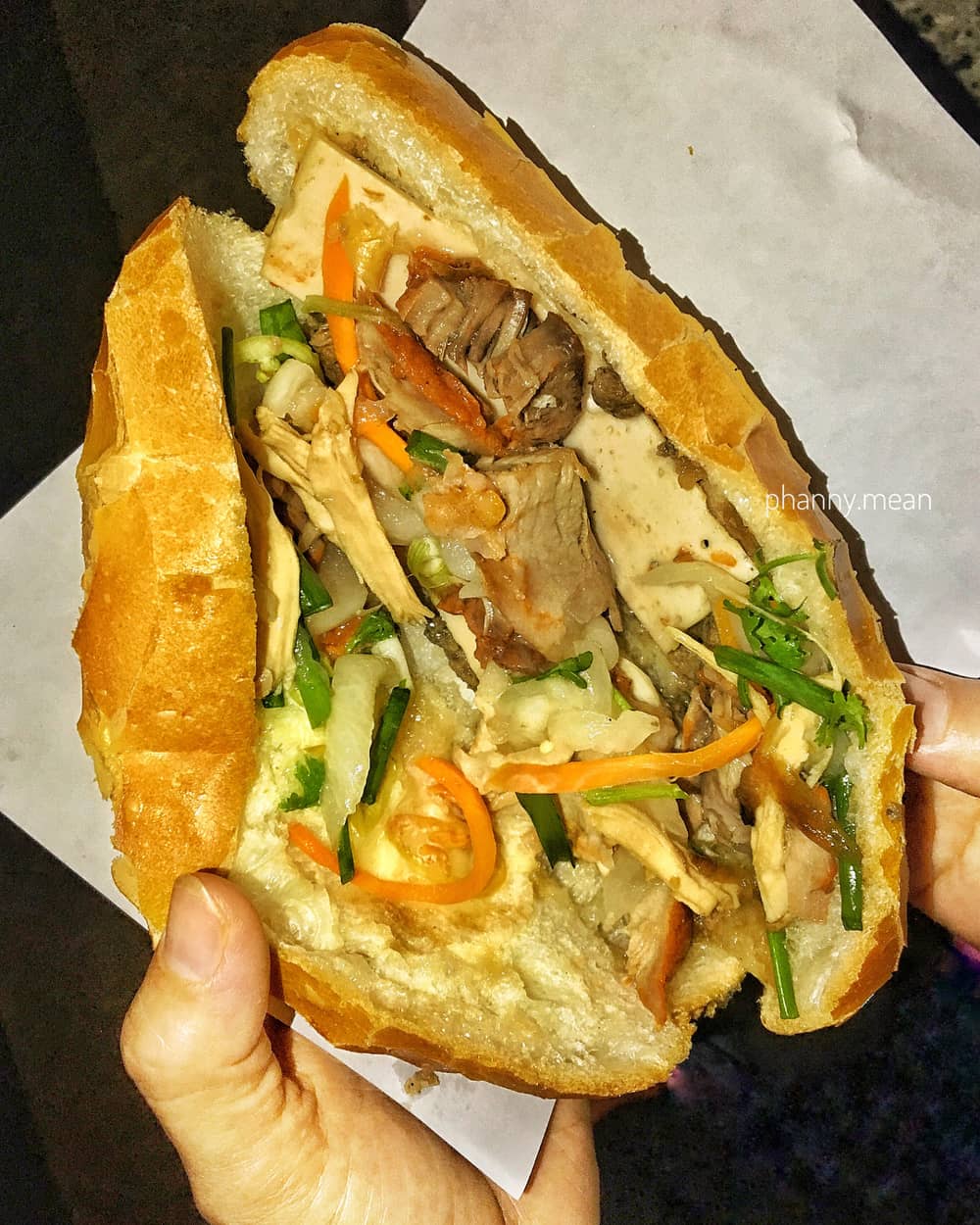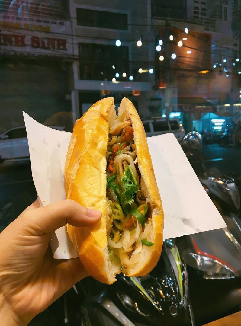Một ổ bánh mì không tên không quá đầy nhân, tỉ lệ thịt, chả vừa phải. Địa chỉ: Góc đường Lý Thường Kiệt - Đồ Chiểu, TP Vũng Tàu. Mức giá trung bình: 15.000 đồng. Xe bánh mì này thường đông khách, nên có thể bạn sẽ phải xếp hàng chờ đợi hơi lâu. Ảnh: @phanny.mean.