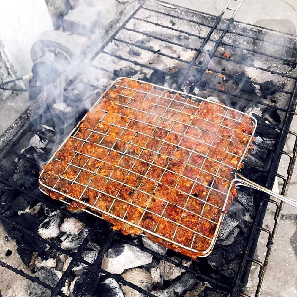 Bún thịt nướng: Thịt đem nướng được xếp khít với nhau, cho lên vỉ rồi nướng quạt than. Thịt được tẩm ướp dậy mùi của bột điều và sả thơm nức, đậm đà. Thứ làm nên linh hồn của món bún chả nướng phải kể đến là nước chẻo, thứ nước dùng với nước ướp thịt, bột năng và lạc. Nước chấm này gọi là chẻo bởi nước ở dạng sốt đặc, khi ăn chan vào bún rồi trộn đều. Ảnh: @linhchimm.