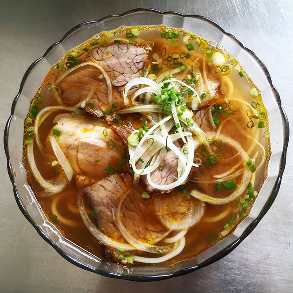 Bún bò Huế không xuất phát từ Sài Gòn nhưng vẫn là món ưa thích của nhiều thực khách. Món ăn có vị cay nồng, thơm và no lâu. Nước lèo nổi bật màu đỏ đặc trưng, thường được hầm xương bò với sả. Tô bún đầy đủ phải có vài lát thịt bò, chả lụa, giò heo, hành lá... Buổi sáng, quán bún bò Huế chú Há trên đường Võ Văn Tần là địa chỉ được nhiều thực khách ghé chân. Mỗi phần ăn có giá từ 45.000 đồng.