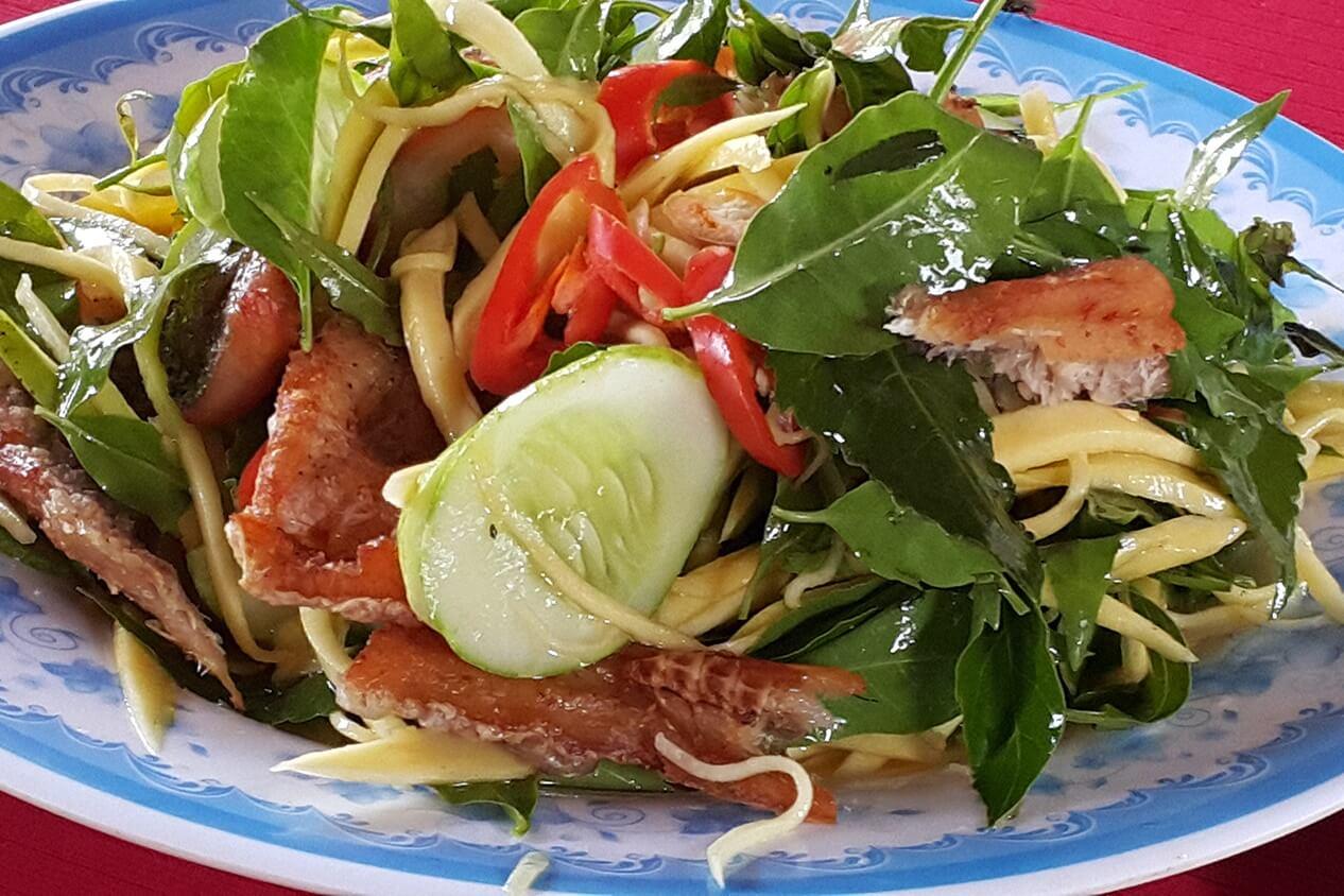 Trong số các món ăn từ cây sầu đâu phải kể đến gỏi khô cá sặc. Những con khô được nướng rồi xé nhỏ. Nguyên liệu còn có thịt heo luộc cắt miếng, dưa leo bào mỏng. Người thích ăn cay có thể yêu cầu gia giảm ớt trái.