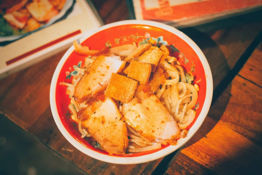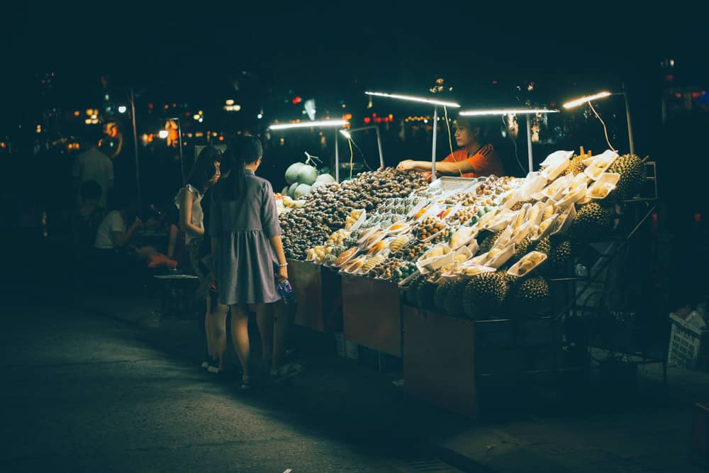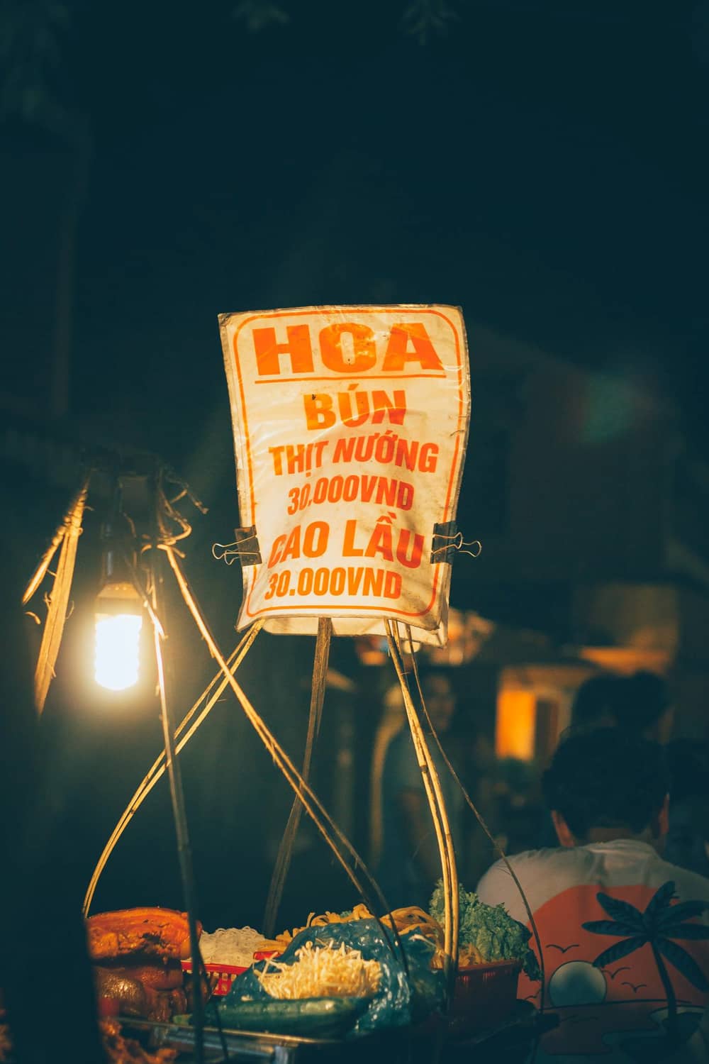 Ẩm thực đêm Hội An cũng rất nhộn nhịp. Những gian hàng ăn đêm chính là một trong những điểm khiến khu phố yên bình thêm sống động. Nơi đây có nhiều món ngon nổi tiếng như cao lầu, bánh tráng, các đồ chiên nướng, hoa quả miền Trung...