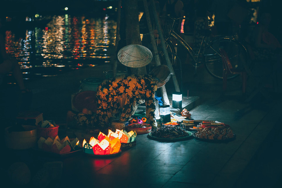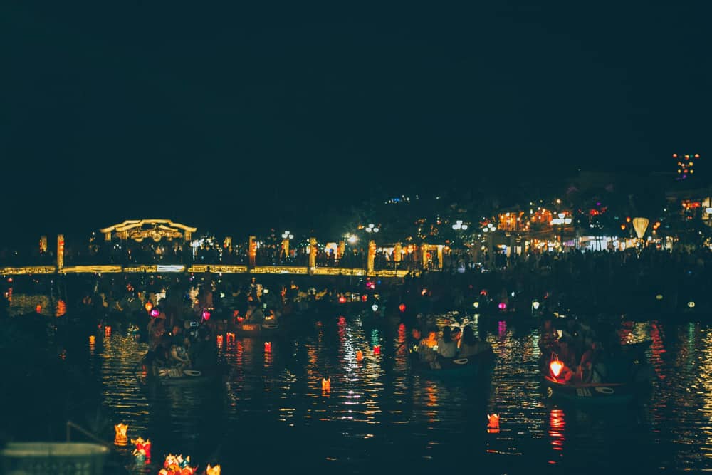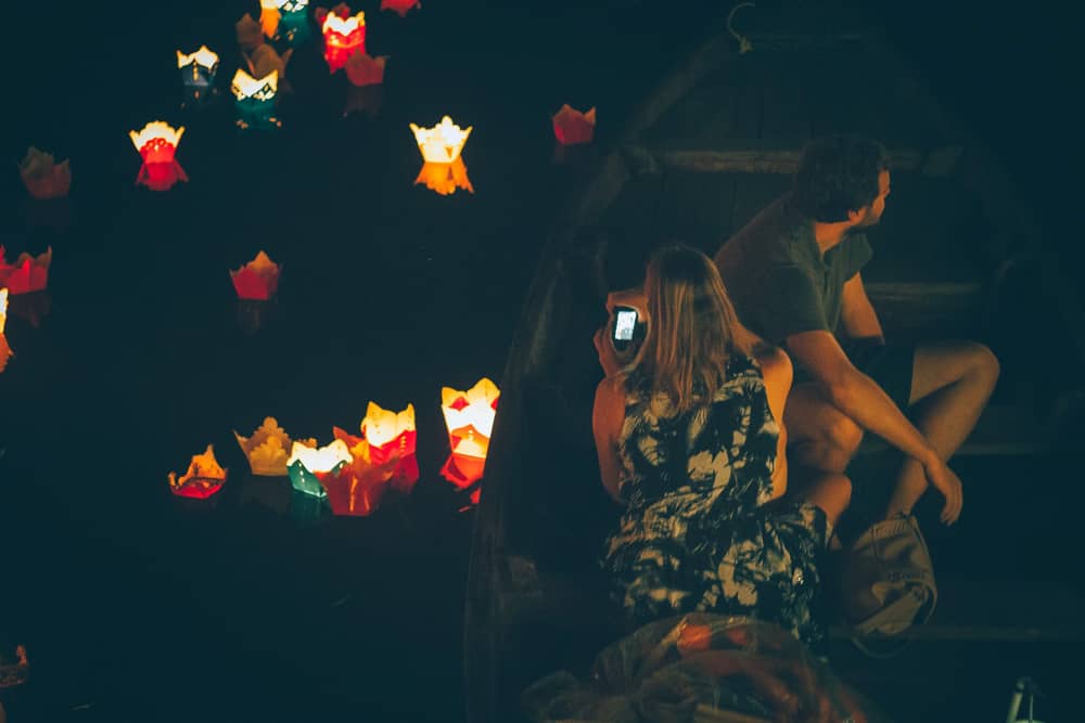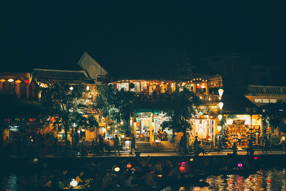 Nhiều người nói đêm Hội An thường tẻ nhạt hơn ban ngày và ít chụp được những tấm ảnh đẹp. Nhưng nếu để ý, bạn sẽ nhận thấy Hội An về đêm mang nét đẹp rất đặc trưng bởi ánh đèn lồng sáng phố, những ngọn đèn hoa đăng lập lờ trên sông. Ngồi thuyền thả đèn hoa đăng là một trong những hoạt động quen thuộc trong phố cổ.