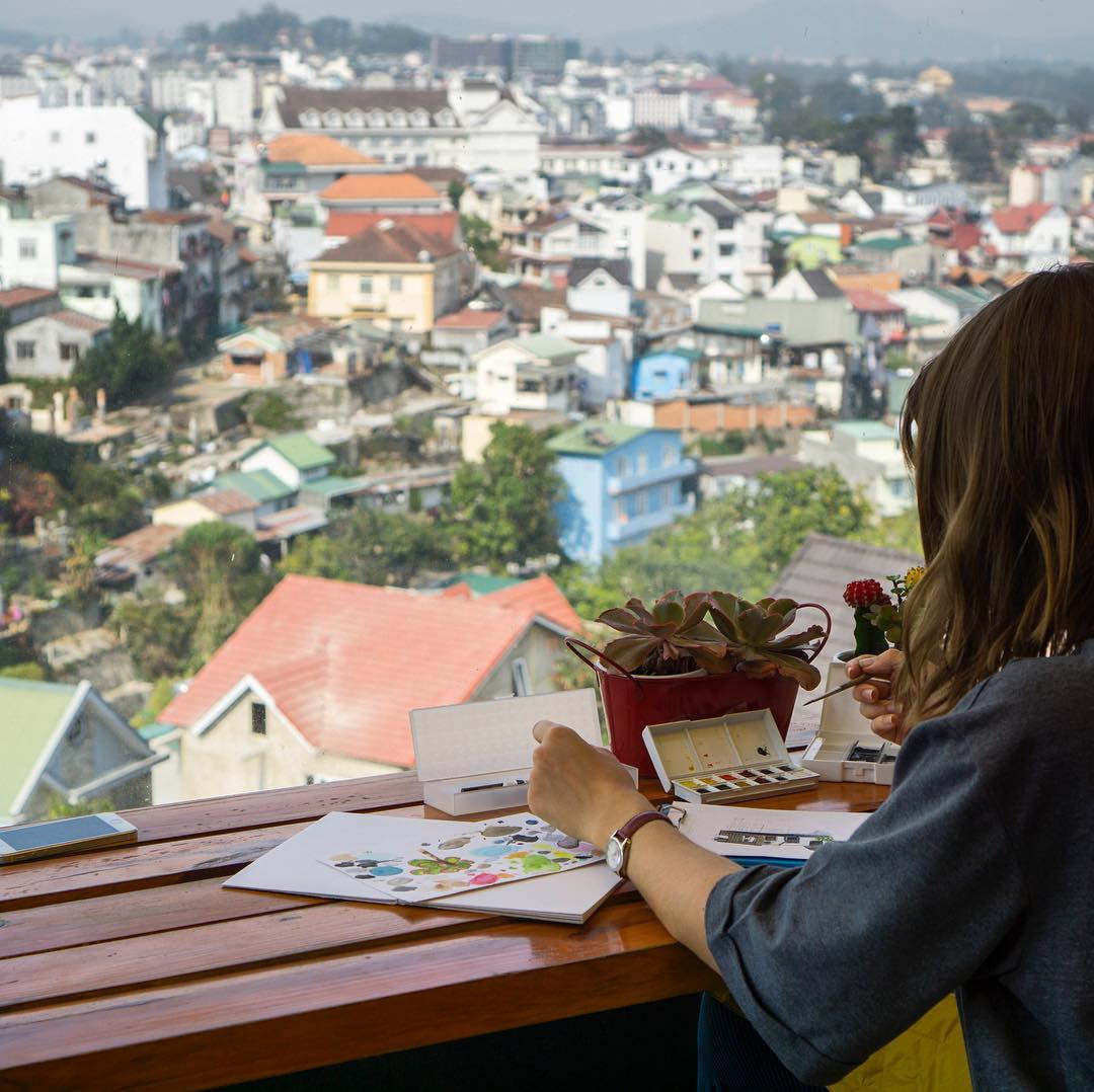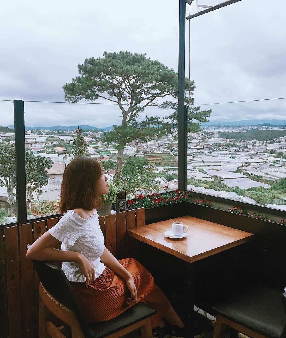 Up Coffee Dalat: Điểm cộng của Up Coffee Dalat là vị trí thuận tiện ngay khu vực trung tâm thành phố, nên bạn không cần phải đi quá xa để tìm một không gian cà phê đẹp, có tầm nhìn thoáng đãng. Qua lớp kính trong suốt, bạn có thể nhìn thấy các công trình kiến trúc như những mô hình thu nhỏ vừa quen thuộc, vừa lạ lẫm. Khung cảnh những dãy nhà nằm chênh vênh, chen chúc nhau đặc trưng của đô thị Đà Lạt hẳn sẽ mang đến background "sống ảo" cực chất. Ảnh: @ladii_nam.
