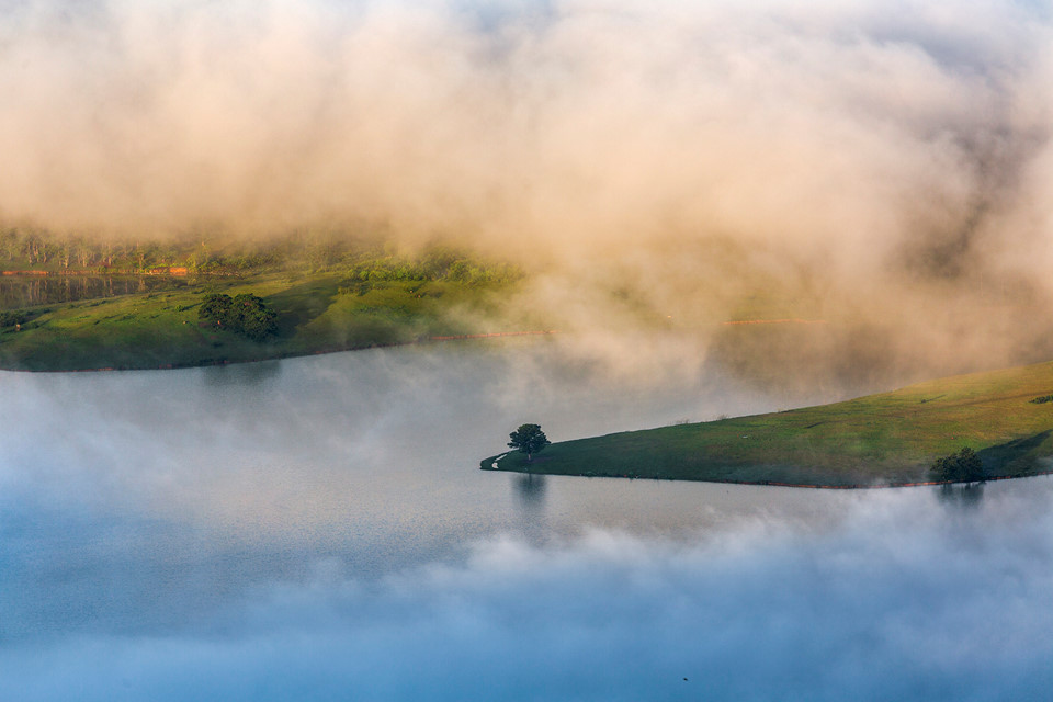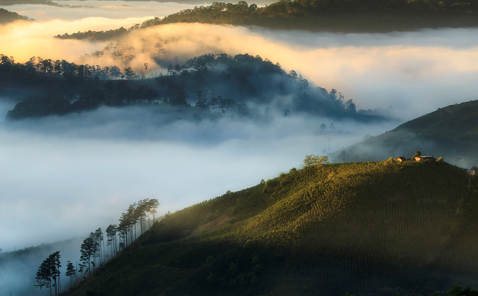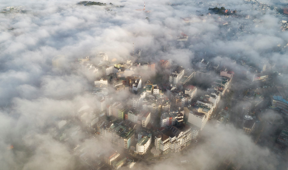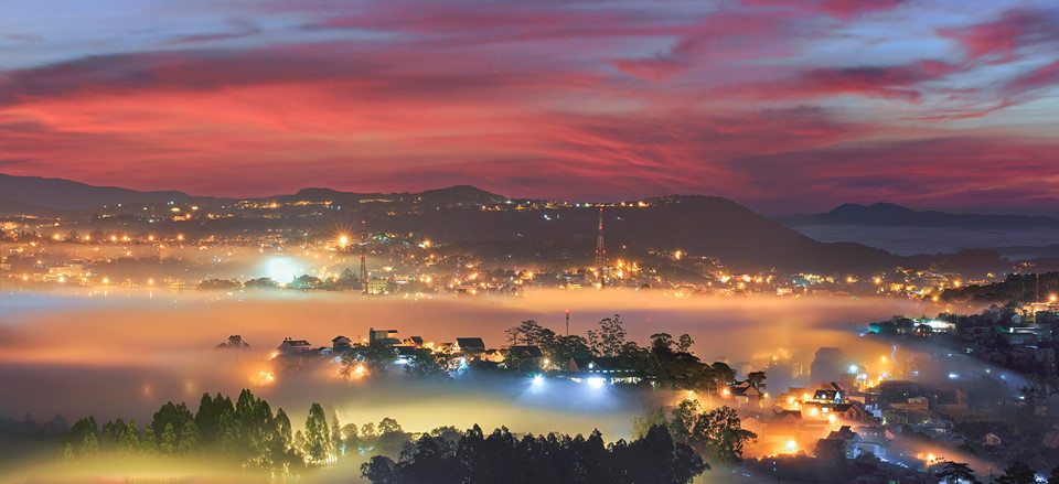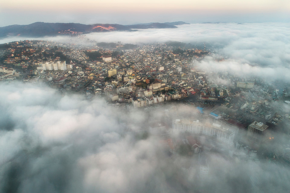 Sau một đêm dài, Đà Lạt mang vẻ đẹp trữ tình trong khoảnh khắc ban mai. Khi những tia nắng đầu tiên chiếu xuống từng nhành cây kẽ lá, thành phố mơ màng chào đón ngày mới trong không gian xanh mướt, bồng bềnh bởi lớp sương mỏng manh hòa với làn mây trắng, bao phủ khắp khu rừng huyền ảo.