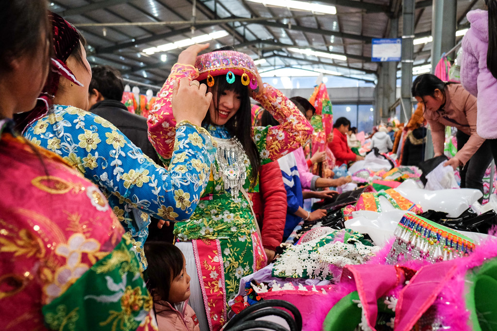 Một bạn gái người Mông đang thử khăn đội đầu, loại trang sức truyền thống của dân tộc thường được sử dụng trong các dịp lễ hội. Những quầy hàng bán quần áo tại đây luôn rất rực rỡ, thu hút cả người dân địa phương lẫn du khách ghé qua.