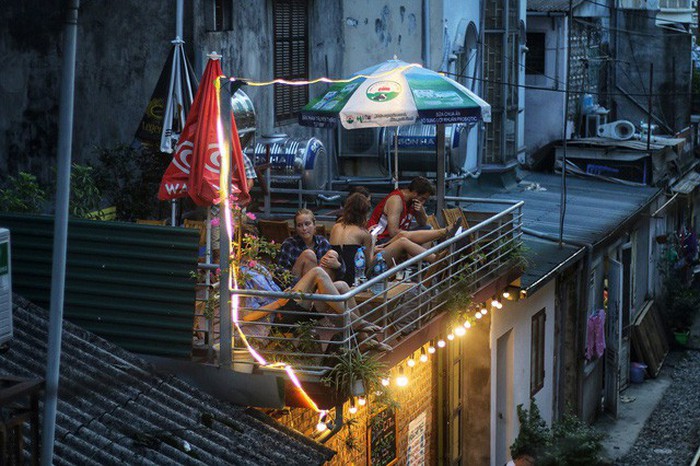Những du khách nước ngoài ngồi đợi chuyến tàu tối lúc 19h tại một quán cà phê nhỏ ở xóm đường tàu. Ảnh: Thanh Thúy
