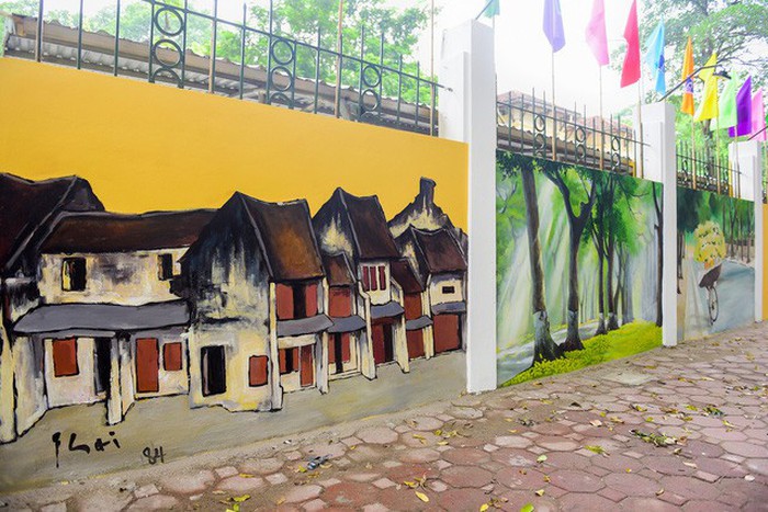 Các bức tranh đều được các họa sỹ vẽ trên tường bao quanh trường. Hình ảnh Hà Nội cổ kính với cây cầu Long Biên lịch sử bắc qua dòng sông Hồng, chợ Đồng Xuân, ga tàu điện, Chùa Một Cột cổ kính… hiện lên đầy sinh động, chân thực.