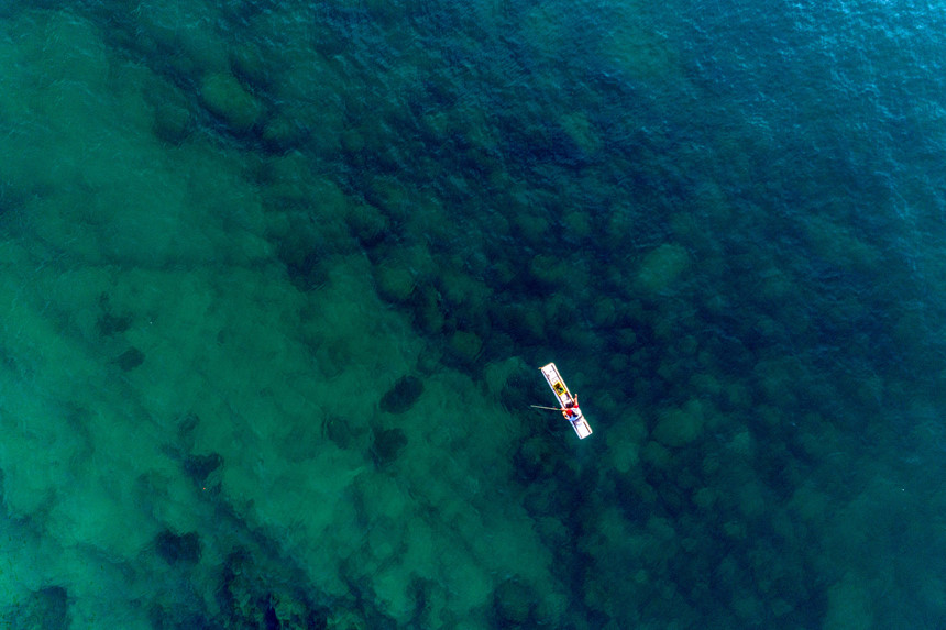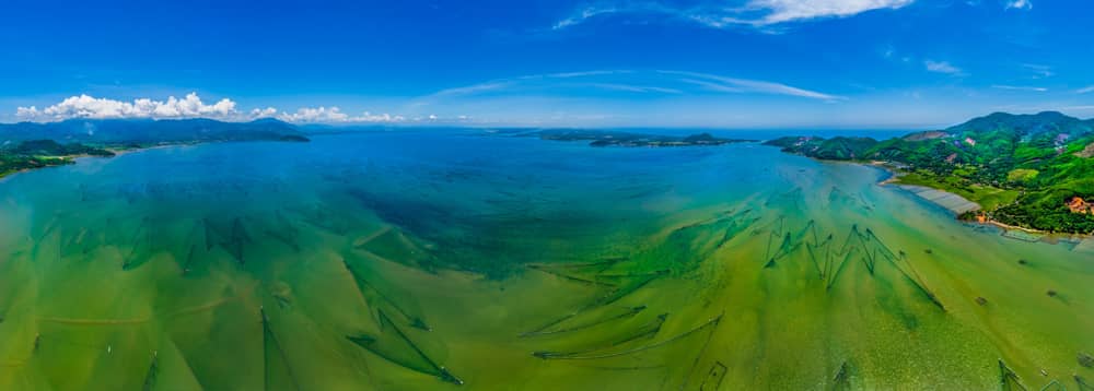 Dưới làn nước trong xanh là những bãi san hô nhiều màu. Những chiếc thuyền nhỏ xinh thấp thoáng giữa làn nước trong như pha lê. Trong vịnh có hơn 200 hộ dân sinh sống trên các ngôi nhà được thiết kế trên phao tạo thành làng nổi có tên Cái Bèo với lịch sử tồn tại hàng nghìn năm.