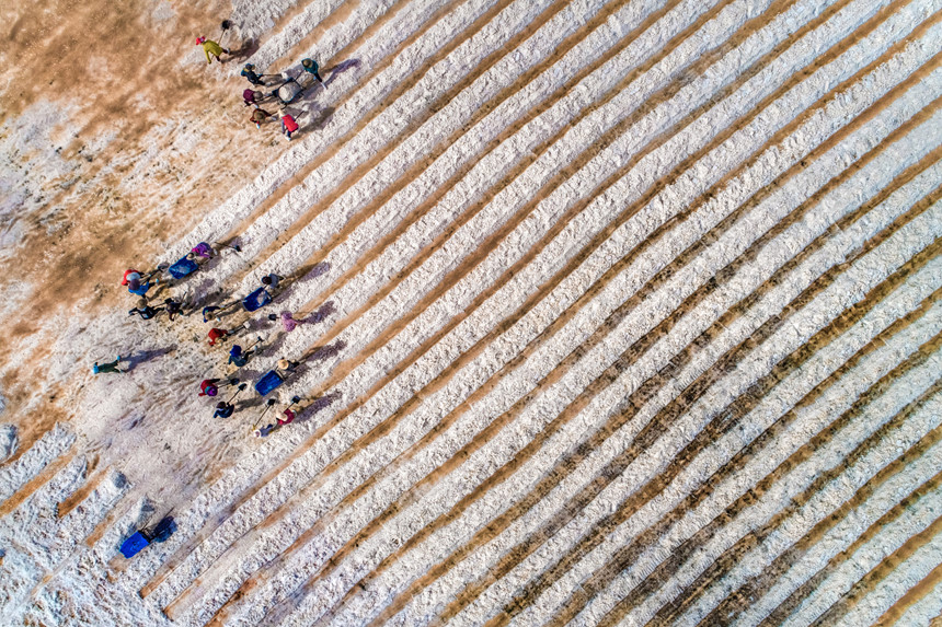 Khung cảnh sống động kết hợp giữa vẻ đẹp của cảnh quan tự nhiên với vẻ đẹp của sự hăng say lao động. Màu trắng xóa bạt ngàn của đồng muối nổi bật giữa nền trời xanh ngắt và màu nâu của ruộng đồng tạo nên nét đặc trưng cho vùng đất nắng gió.
