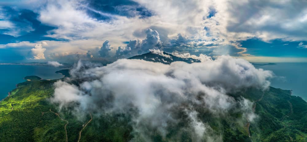 Tháng 8 là mùa đẹp nhất ở Huế, trời ít mưa và nắng rực rỡ. Những tấm hình tại đây được chụp lúc 16h. Tôi đứng trên đỉnh đèo, gần Hải Vân Quan và cho máy bay lên cao 300-400 m, có lúc lên kịch trần 500 m, gió khá mạnh. Nhìn qua màn hình lúc này cả tôi và bạn đồng hành đều sững sờ không tin vào mắt mình. Lăng Cô quá đẹp, trời xanh, biển biếc, từng tảng mây trắng lập lờ như ngay dưới chân mình.