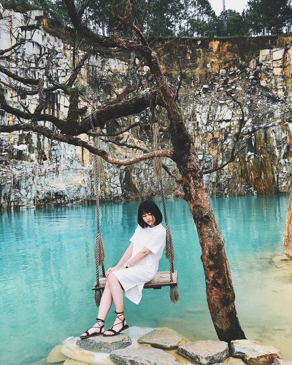 Tuyệt Tình Cốc: Tuyệt Tình Cốc thực chất là một mỏ đá hoa cương bị bỏ hoang nằm ở suối Cạn, xã Lát, huyện Lạc Dương. Sau thời gian dài không khai thác, mưa và các mạch nước ngầm đã tạo nên một hồ nước với màu xanh ngọc bích ảo diệu như trong những bộ truyện kiếm hiệp của Kim Dung. Xung quanh hồ nước là những vách đá dựng đứng uy nghi. Ảnh: @gianguyn, @cobeyeudoi123.
