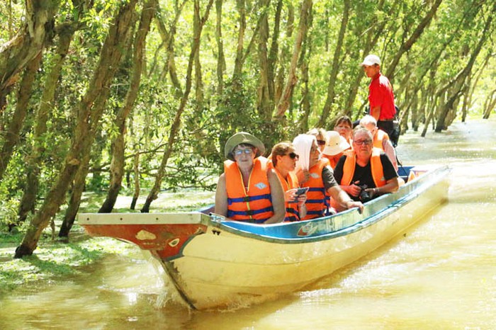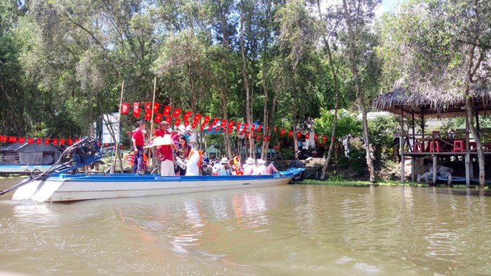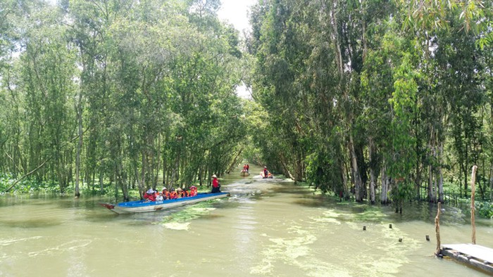 Khách du lịch trong nước thích thú khi tham quan rừng tràm Trà Sư.