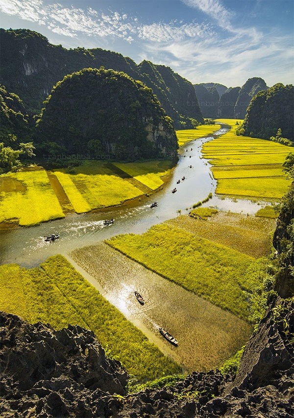 Tam Cốc hiên lên với sắc vàng tươi của màu lúa chín, màu nắng ban mai điểm xuyết với màu xanh của núi rừng, màu rêu phong của lớp đá vôi hàng ngàn năm lịch sử.Nguồn: Trần Bảo Hòa