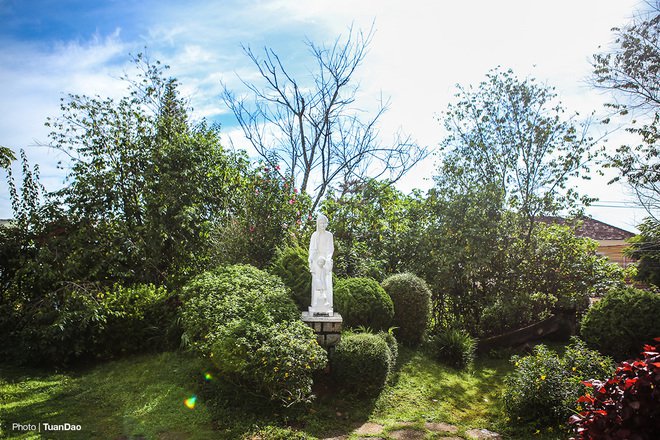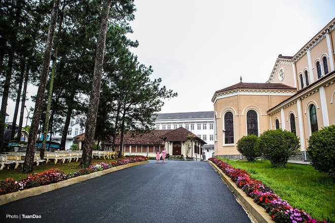 Khuôn viên phía ngoài sân của nhà thờ, trồng nhiều cây thông, một loài cây đặc trưng của Đà Lạt.